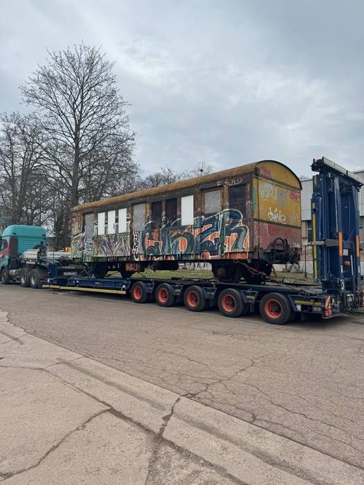 Neun Meter lang, Baujahr 1924/25, zuletzt im Betrieb in den 1960er Jahren, seit Jahrzehnten abgestellt – jetzt soll der Beiwagen EB 169 015a, ein Mittelwagen aus dem S-Bahntriebzug der Bauart Bernau, für die Stiftung Deutsches Technikmuseum Berlin rekonstruiert und restauriert werden. Der Wagen wird dann das einzige vollständige Fahrzeug der Bauart „Bernau“ sein, und somit der älteste vollständig erhaltene Berliner S-Bahn-Wagen. Nach einiger Vorbereitungszeit war es am 25. Februar 2025 soweit: Der historische Beiwagen wurde per LKW nach Halberstadt zur VIS Verkehrs Industrie Systeme GmbH überführt. Ziel der Rekonstruktion ist es, in den nächsten Monaten eine geschlossene Darstellung im letzten Betriebszustand der 1960er Jahre zu erreichen, um den Beiwagen EB 169 015a als Museumsstück an das Deutsche Technikmuseum zurückzugeben. Hauptaufgaben im Rahmen der Sanierung werden die Instandsetzung der Stahlkonstruktion, von Türen und Fenstern sowie die Rekonstruktion des Innenausbaus sein. Um eine möglichst originalgetreue Restaurierung zu erreichen, werden die Mitarbeitenden der Stiftung Deutsches Technikmuseum Berlin bei der Katalogisierung, Recherche von Zeichnungen und Unterlagen sowie bei der Bereitstellung von Ersatzteilen unterstützen. Wir freuen uns auf eine spannende Zusammenarbeit.